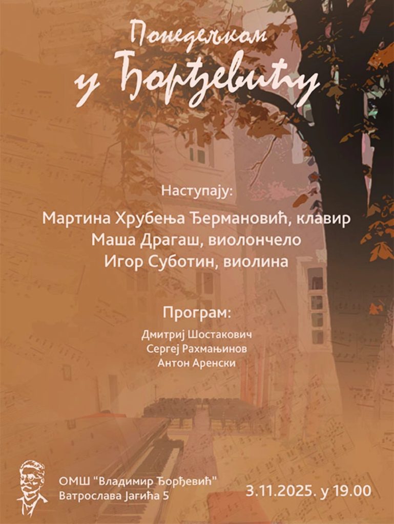 У понедељак, 03.11.2025. у 19 часова, очекује нас још један концерт камерне музике у оквиру циклуса „Понедељком у Ђорђевићу“. Публици ће се представити Мартина Хрубења Ђермановић (клавир), Маша Драгаш (виолончело) и Игор Суботин (виолина).