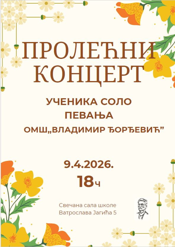 У сали наше школе одржан је Пролећни концерт ученика соло певања. Наступили су: Невена Лојаница, Маша Самарџић и Тијана Станковић, I разред, Нађа Ивковић и Татјана Ковачевић, II разред, Анастасија Андрејевић, III разред, Стефан Димић, Дубравка Мутавџић и Тијана Томић, IV разред, класа: Снежана Шипић (замена: Милица Лолић), клавирски сарадник: Емилија Миодраг.