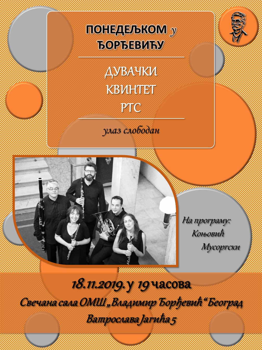 19/11/2019 АктуелностиПонедељком у Ђорђевићу 18.11.2019. – „Понедељком у Ђорђевићу“ – Дувачки квинтет РТС Наступом Дувачког квинтета РТС, отворена je нова сезона концертног серијала „Понедељком у Ђорђевићу“ – Уживали смо у њиховом сјајном музицирању! Подели: