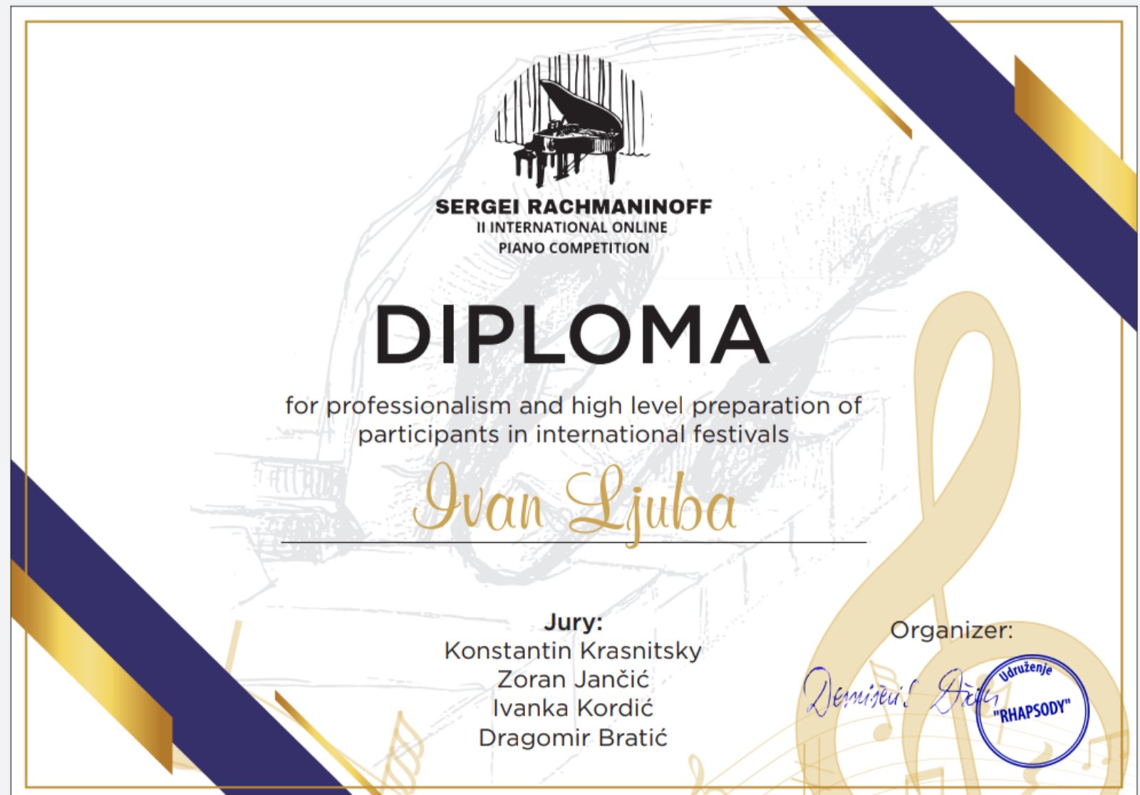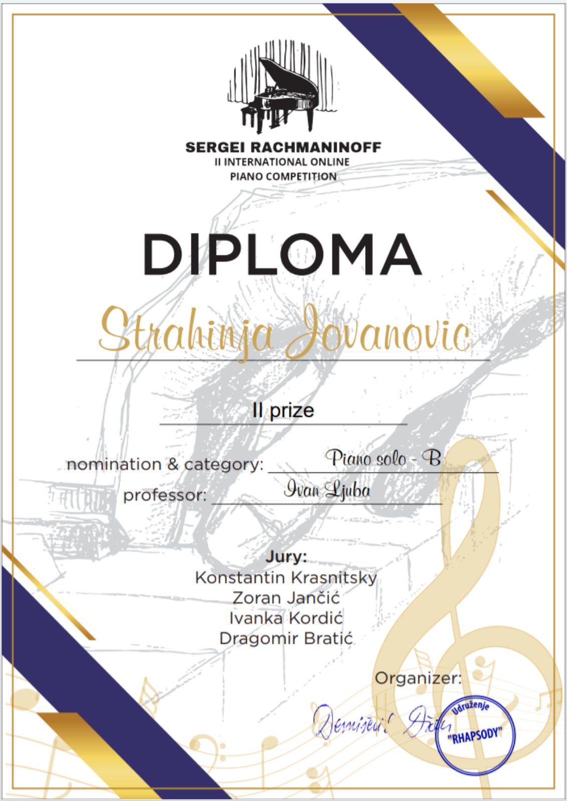 20/06/2022 АктуелностиНаграде 19.06.2022. – II интернационално онлине пиано такмичење „Sergei Rachmaninoff“ Страхиња Јовановић, IV разред клавира, класа: Иван Љуба – II награда Честитамо!!! Подели: