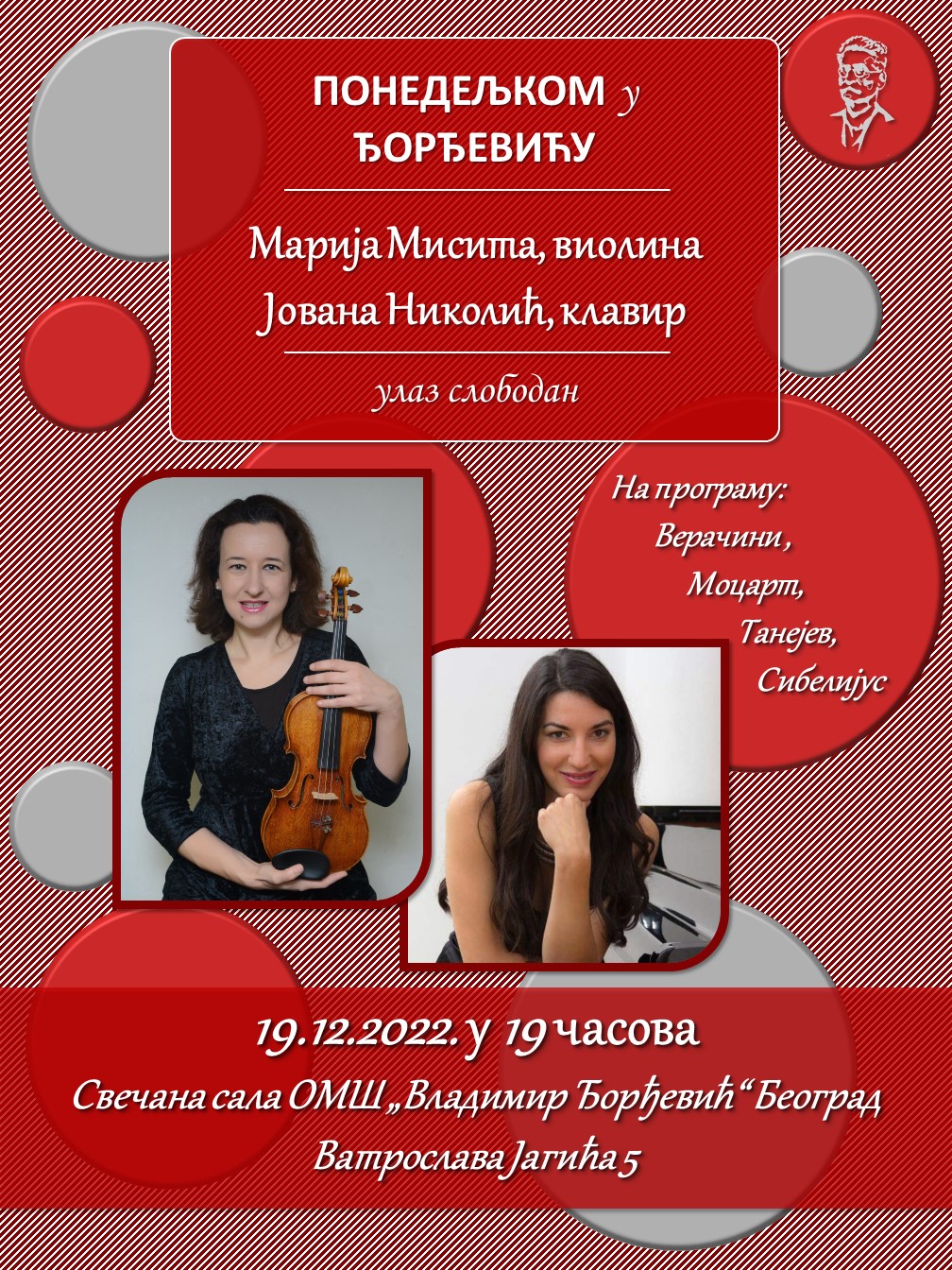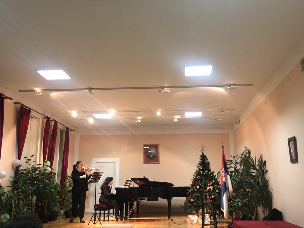 08/12/2022 АктуелностиПонедељком у Ђорђевићу 19.12.2022. – „Понедељком у Ђорђевићу“ – Марија Мисита (виолина) и Јована Николић (клавир) У оквиру циклуса „Понедељком у Ђорђевићу“ у сали наше школе одржан је још један концерт – наступиле су Марија Мисита (виолина) и Јована Николић (клавир). Подели: