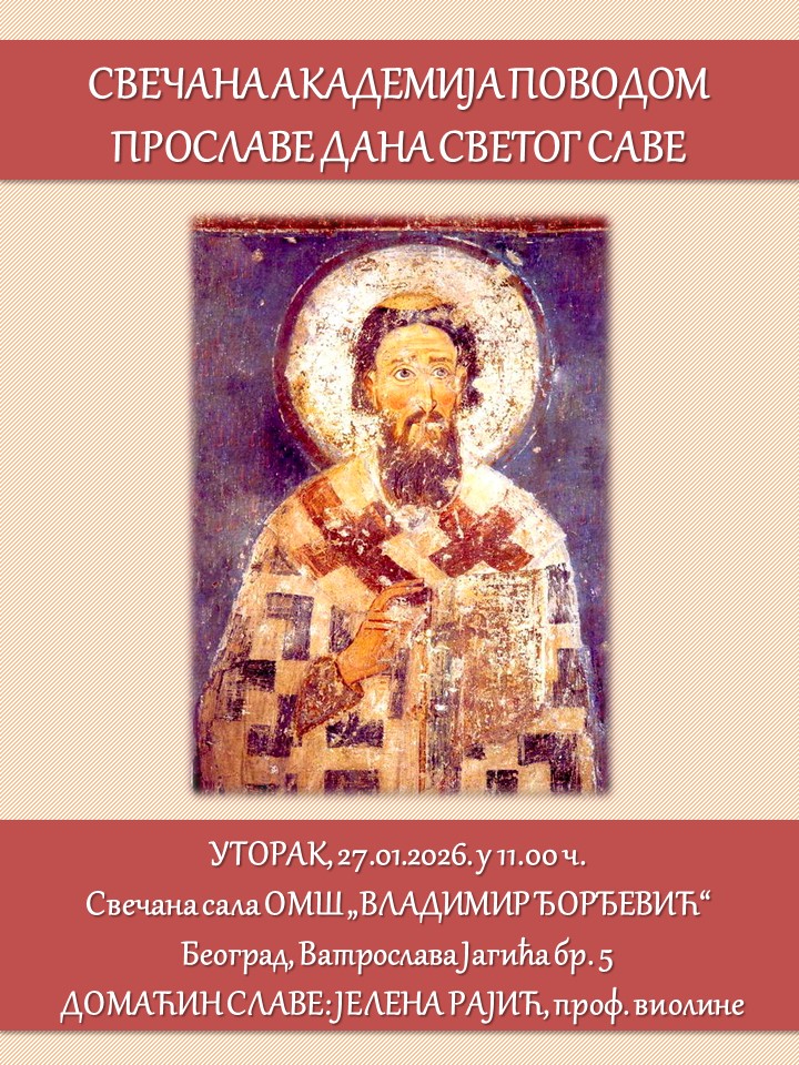 [vc_row][vc_column][vc_column_text]У уторак, 27.01.2026. у 11 часова у свечаној сали наше школе биће одржана традиционална Светосавска академија, у оквиру које ће домаћин славе Јелена Рајић доделити сребрњак најуспешнијем ученику током претходне школске године – Петру Вулетићу, V разред кларинета, класа: Драган Гњатовић.
