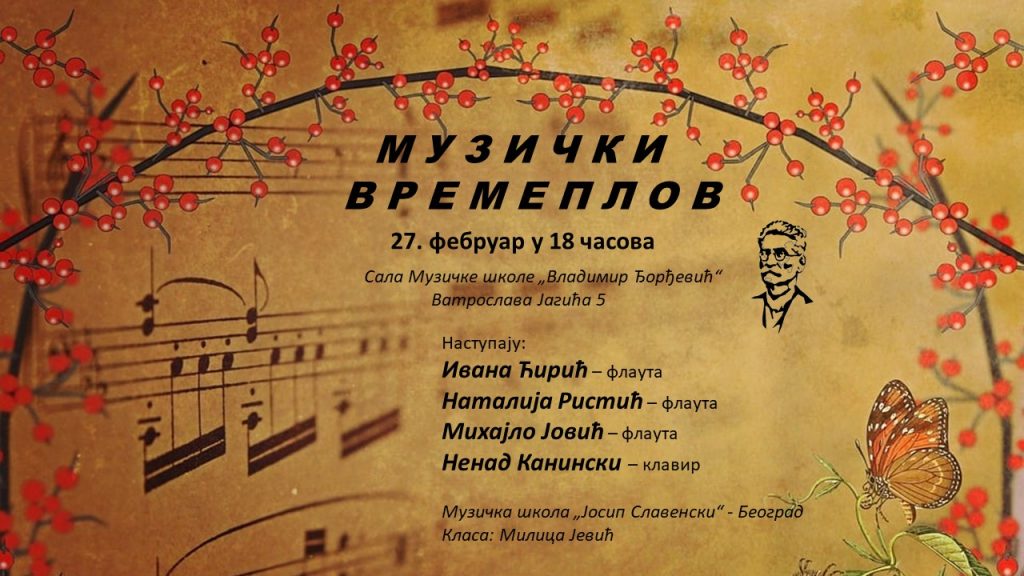 У оквиру пројекта „Музички времеплов“, у сали наше школе одржан је концерт ученика флауте из МШ „Јосип Славенски“, класа: проф. Милица Јевић. Публици су се представили Наталија Ристић и двоје бивших ученика наше школе – Ивана Ћирић и Михајло Јовић; клавирски сарадник: Ненад Канински.