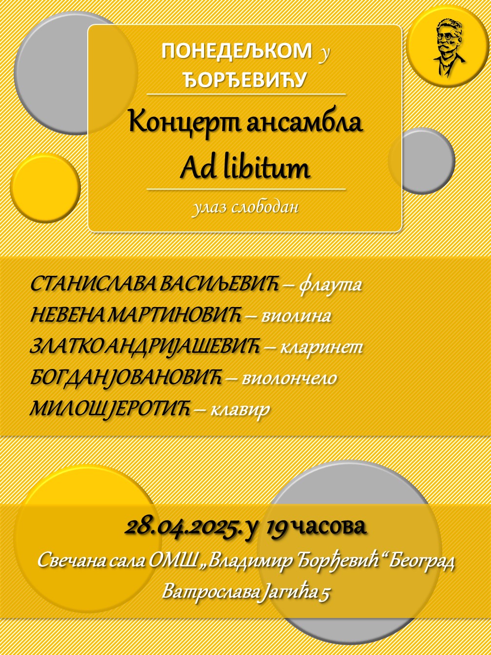 22/04/2025 АктуелностиПонедељком у Ђорђевићу 28.04.2025. – „Понедељком у Ђорђевићу“ – Концерт ансамбла „Ad libitum“ У сали наше школе одржан је још један концерт у оквиру циклуса „Понедељком у Ђорђевићу“, где се публици представио ансамбл „Ad libitum“ Подели: