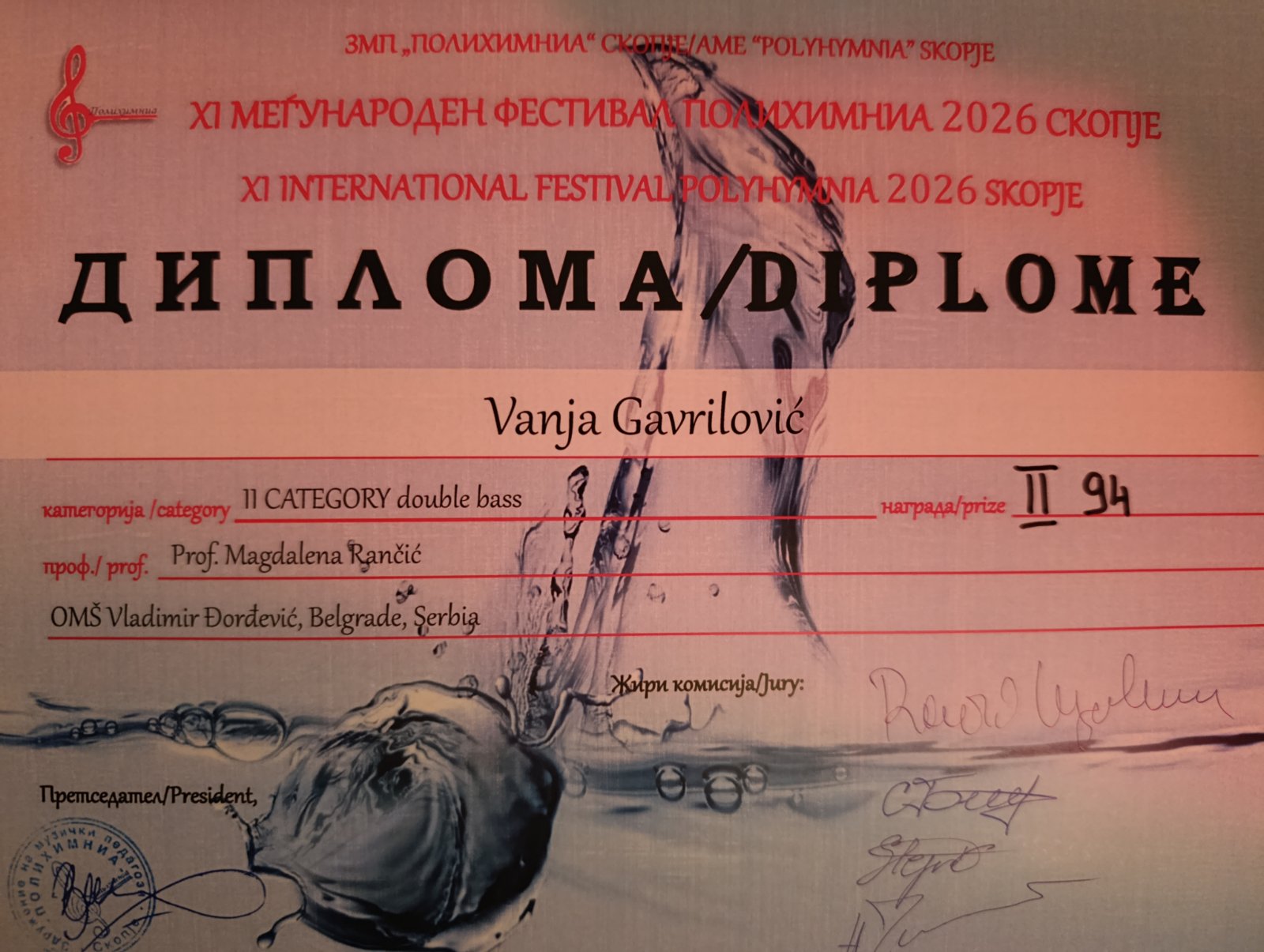 31/03/2026 АктуелностиНаграде 29.03.2026. – Међународни музички фестивал „Полихимниа“ Скопље (Северна Македонија) Вања Гавриловић, II разред контрабаса, класа: Магдалена Ранчић – II награда (94 поена) Честитамо!!! Подели:
