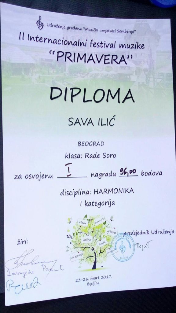 20/03/2017 Награде II ИНТЕРНАЦИОНАЛНИ ФЕСТИВАЛ МУЗИКЕ „ПРИМАВЕРА“ у Бијељини Сава Илић, III разред хармонике, класа: Раде Соро, I награда, 96 бодова. Подели: